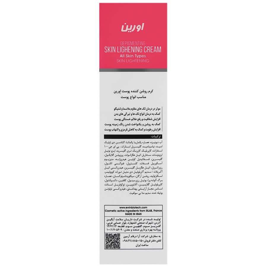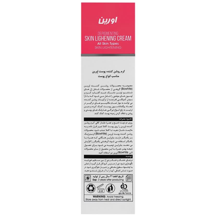 کرم روشن کننده اورین بیوتک محصولی غیر کومدوژن است که با دارا بودن کمپلکسی قدرتمند از ترکیبات روشن کننده و ضد لک، قادر است تمام مکانیسم های درگیر در ایجاد پیگمانتاسیون پوست را مهار کرده و بدین ترتیب انواع تیرگی ها و لک های پوست را برطرف و زمینه پوست را نیز روشن و شفاف نماید.
